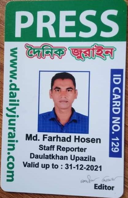 জনাব ফরহাদ হোসেন-কে নিয়োগ সংক্রান্ত শর্তাবলী সাপেক্ষে অনলাইন পত্রিকা “দৈনিক জুরাইন” এর ভোলা জেলার দৌলতখান উপজেলার স্টাফ রিপোর্টার হিসেবে নিয়োগ প্রদান করা হয়েছ। জনাব ফরহাদ হোসেন ন্যায়-নিষ্ঠার সাথে তার দায়িত্ব পালন করবেন। তাহার আইডি নম্বর ১২৯। – বিজ্ঞপ্তি
